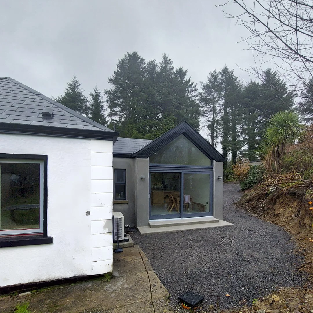 Passive Aluclad triple glazed windows were installed in the existing home, and new build. An aluclad ultratech front door was also installed. Windows and door supplied by Munster Joinery.